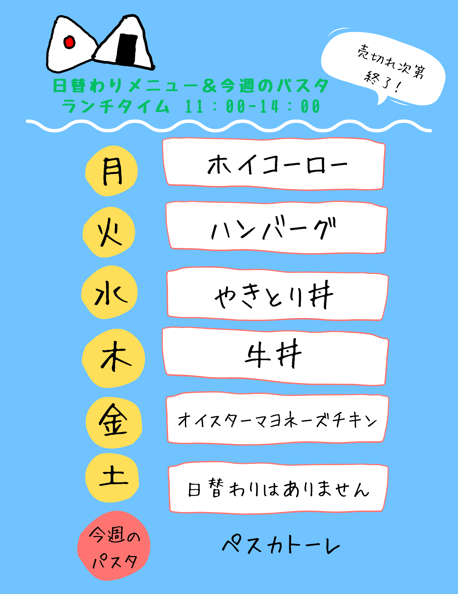 メニューは曜日替わりで4種類から選べますので、お腹いっぱいで幸せいっぱいです♪