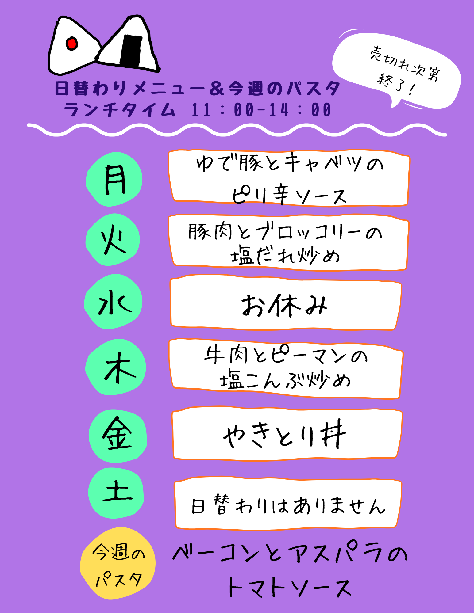 メニューは曜日替わりで4種類から選べますので、お腹いっぱいで幸せいっぱいです♪