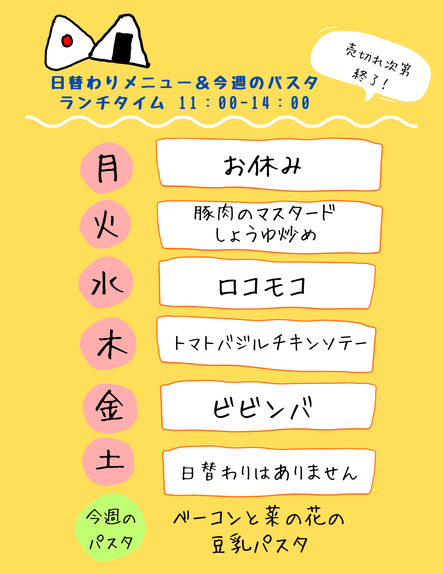 メニューは曜日替わりで4種類から選べますので、お腹いっぱいで幸せいっぱいです♪